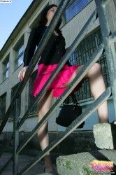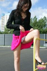 Стройная девушка в розовой юбке гуляет на улице |