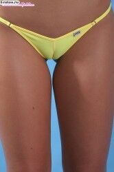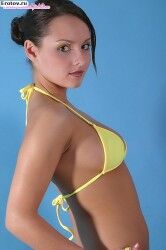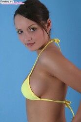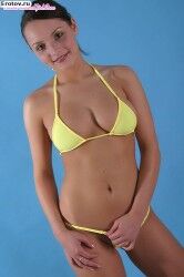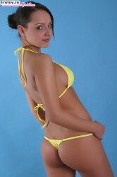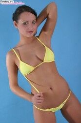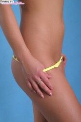 Эротичная загорелая девушка в желтом обтягивающем бикини |