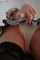 Спелая дама в черных чулках показывает круглую попу |