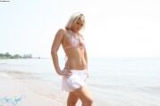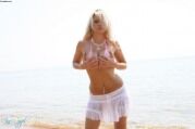 Сексуальная девушка на пляже в прозрачном бикини |