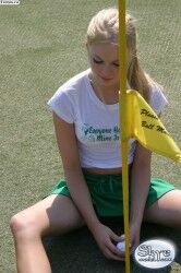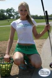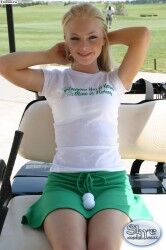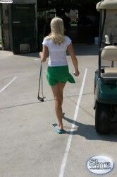 Аппетитная девушка в зеленой мини юбке сидит на корточках |