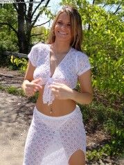 Красавица в белом прозрачном платье показывает трусики между ног |
